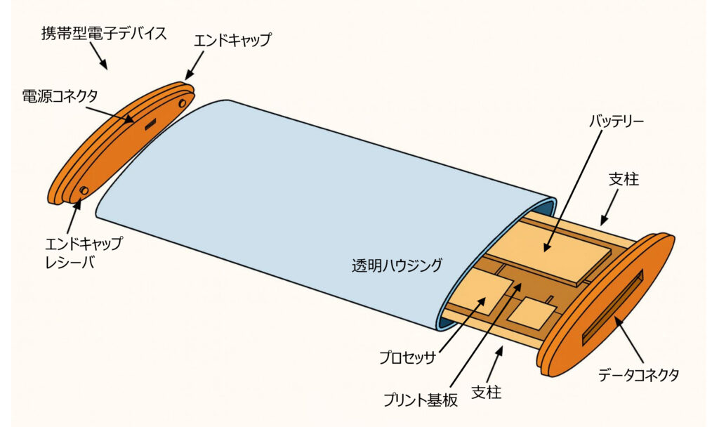 透明筐体(102)は、中空のガラスチューブ状の構造になっています。その内部へ、内部フレーム+電子部品の心臓部ユニットが挿入されていきます。