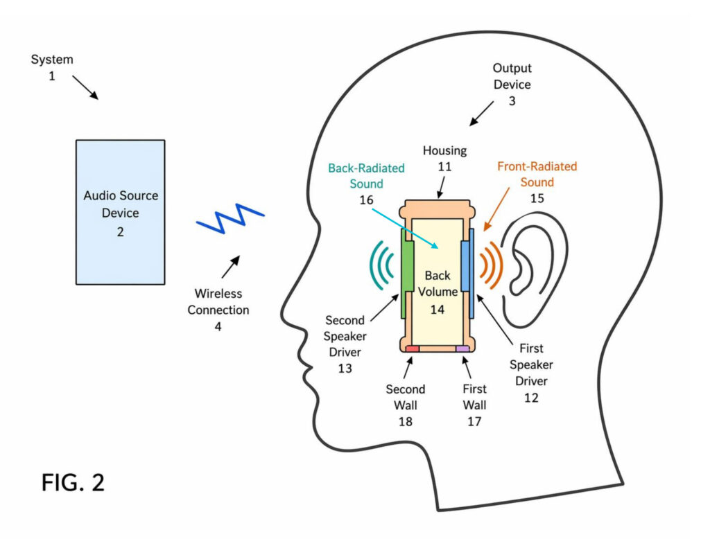この特許の中心にあるのは、1つのケースの中に配置された 第1スピーカードライバ(12)と 第2スピーカードライバ(13)です。両者は異なる位置に配置されていますが、共通バックボリューム(14)を共有します。この構成を持つ出力デバイス(3)は、ユーザーの耳の近くで音を出しつつ、必要に応じて パブリックモード と プライベートモード を切り替える仕組みとして説明されています。
