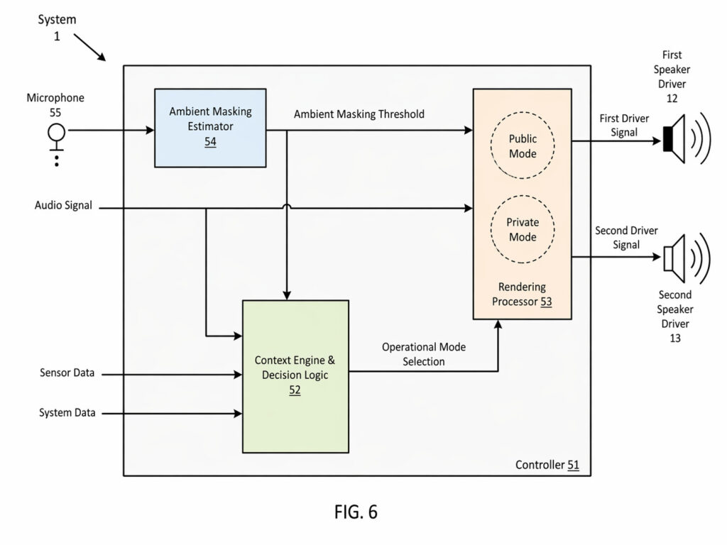 この構成のポイントは、まずアンビエントマスキング推定器(54)が環境騒音の周波数成分を見て、どの帯域が周囲の音に埋もれやすいかを推定することです。その情報を受けたコンテキストエンジン(52)は、たとえば近くに人がいるか、いま再生しているのが音楽か通話か、さらにバッテリー残量や内部温度がどうかといった条件まで考慮しながら、パブリックモードにするか、プライベートモードにするか、あるいは帯域ごとに両者を併用するかを決めます。最後にレンダリングプロセッサー(53)がその判断に基づいて、2つのスピーカードライバ用の信号を生成します。
