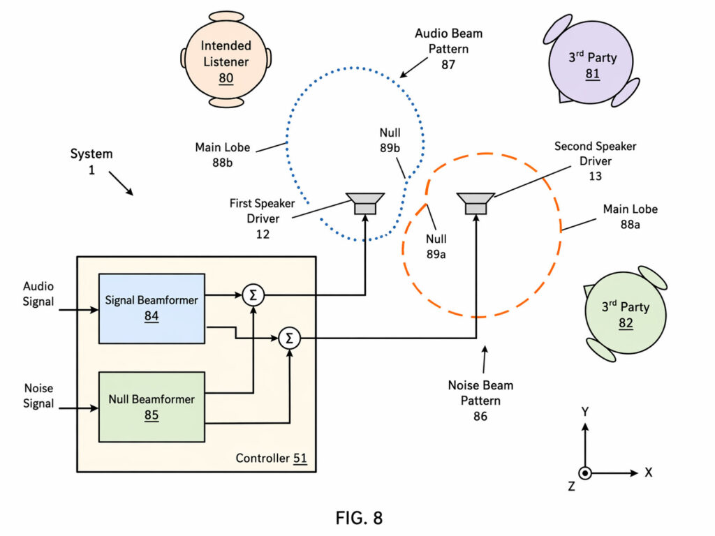 今回取り上げるAppleの公開特許 US20260082146A1 は、まさにその問題に真正面から取り組んだ発明です。この特許の特徴は、従来のように外の騒音を消すのではなく、再生している音そのものの広がり方を制御し、ユーザー以外には聞こえにくくするという発想です。言い換えれば、これはノイズを制御するキャンセリングではなく、「音のプライバシー制御」を行うキャンセリング技術です。しかも、その実現手段は非常に興味深く、2つのスピーカードライバを使った空間的な音場設計と、状況に応じた信号処理の組み合わせにあります。
