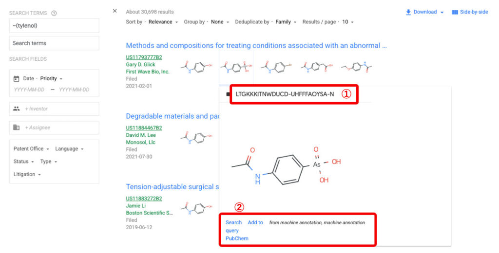 下記は、検索窓に「~tylenol」と入力して、tylenol の類似検索を行った画面です。