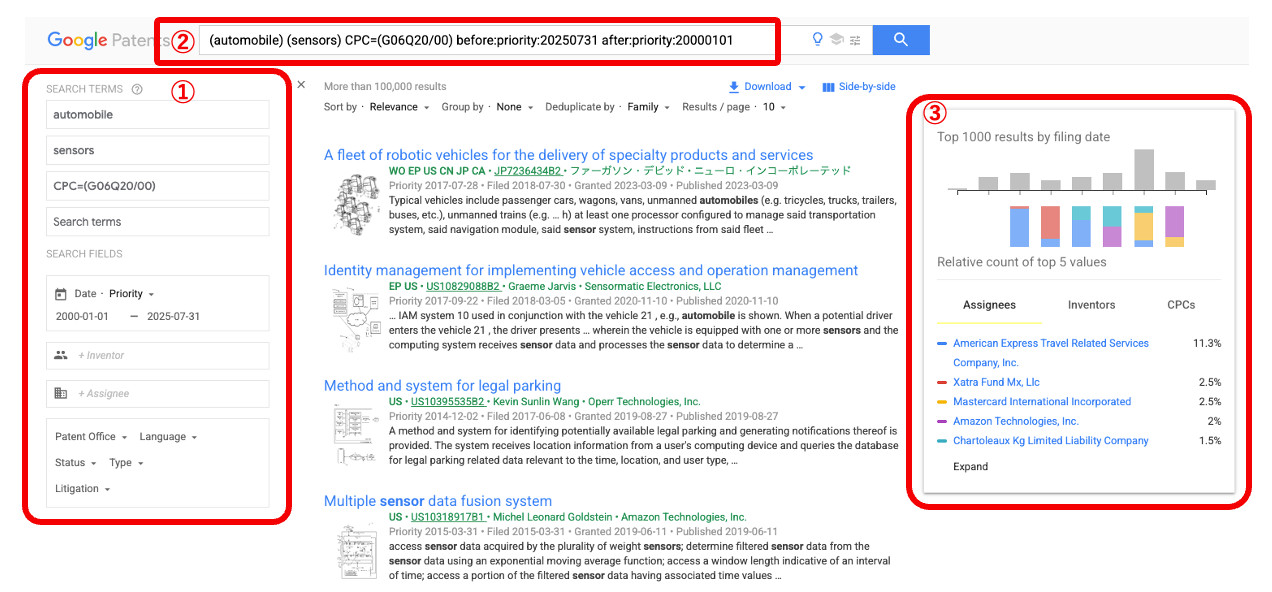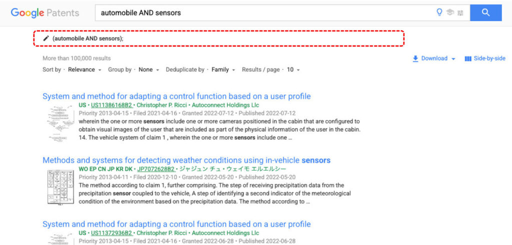 ここで、デフォルトの演算子は、左結合のAND なので、「automobile OR motorcycle sensor」は「(automobile OR motorcycle) AND sensor」と解釈されます。単語には、複数形と類義語が自動的に含まれます。分類(CPC)も「sensor OR G06V20/56」のように特別な構文なしで使えます。