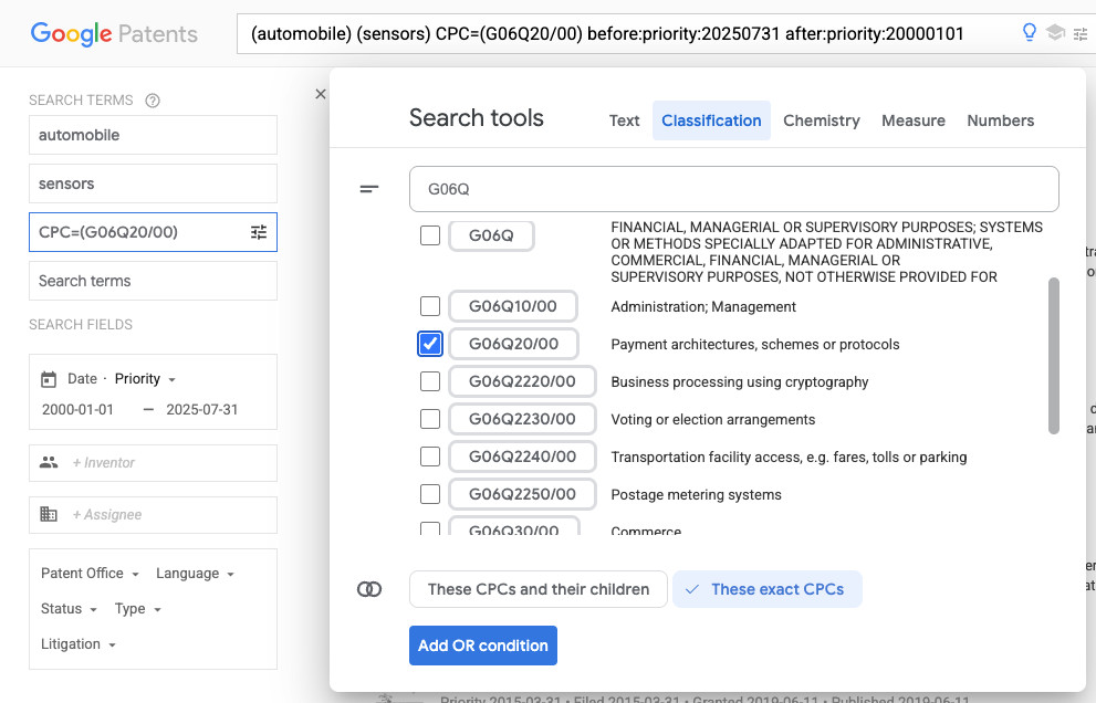 CPCを入力するには、ボックス内の右にあるスライダーアイコンをクリックして、Search tools を表示し、Classification タブを選択して CPC を入力し、「Add OR condition」をクリックします。CPCの一部を入力すると、候補が列挙されるのでたいへん便利です。