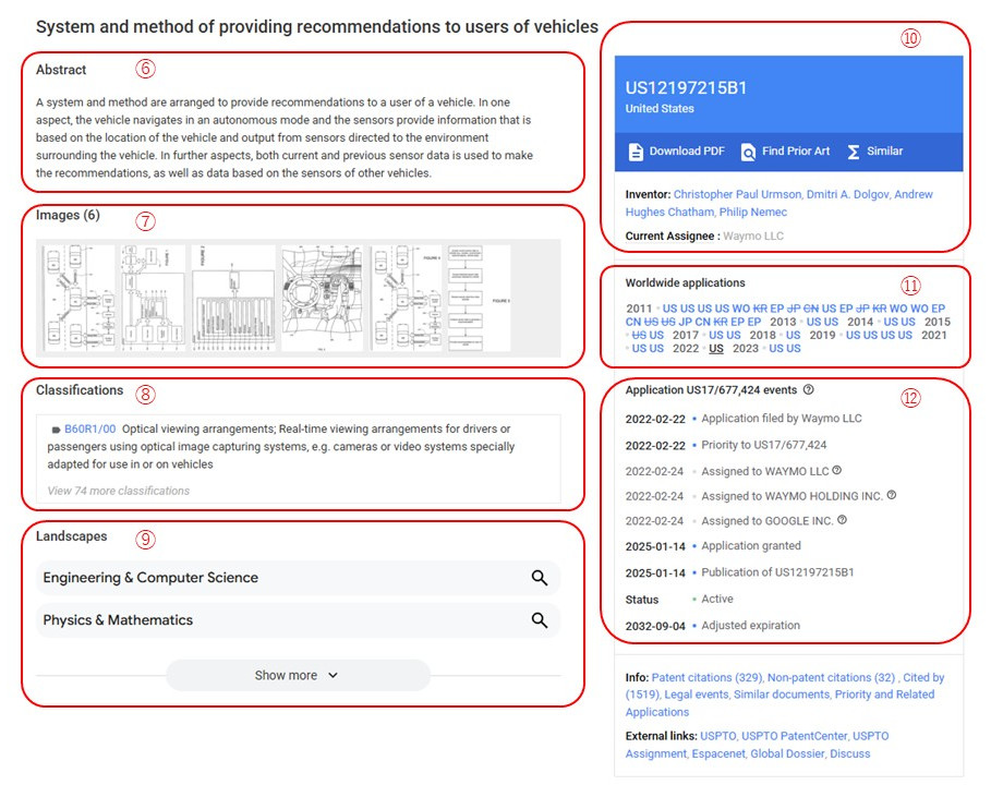 ⑨はその特許に関するランドスケープが表示されます。(ここでのランドスケープは技術分野別に特許情報を分析した結果です。)