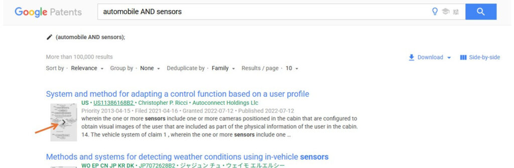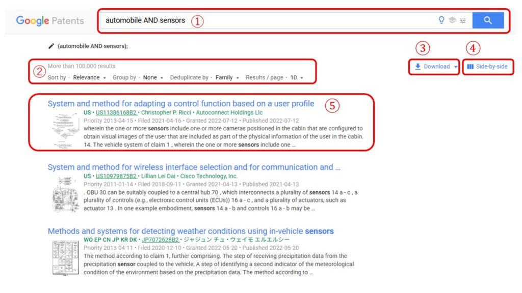 ④ Side-by-side をクリックすると、特許検索結果リストの右側に選択した特許文献が表示されます。Result list をクリックすると元の表示に戻ります。