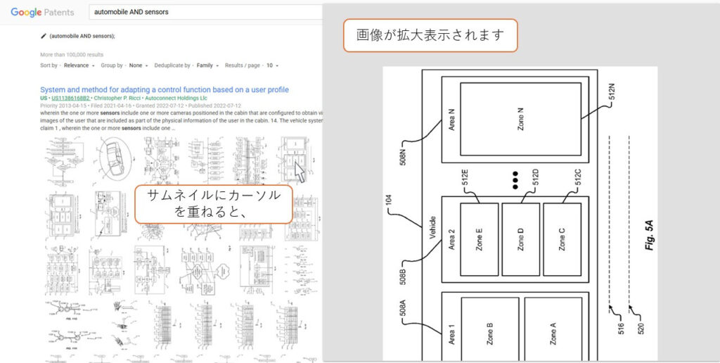 ⑪はこの特許に関連して出願されている特許文献が、年ごとに表示されています。カーソルを合わせれば概要が、クリックすればその特許文献が表示されます。