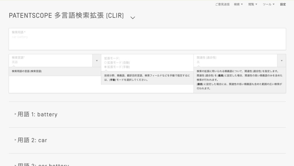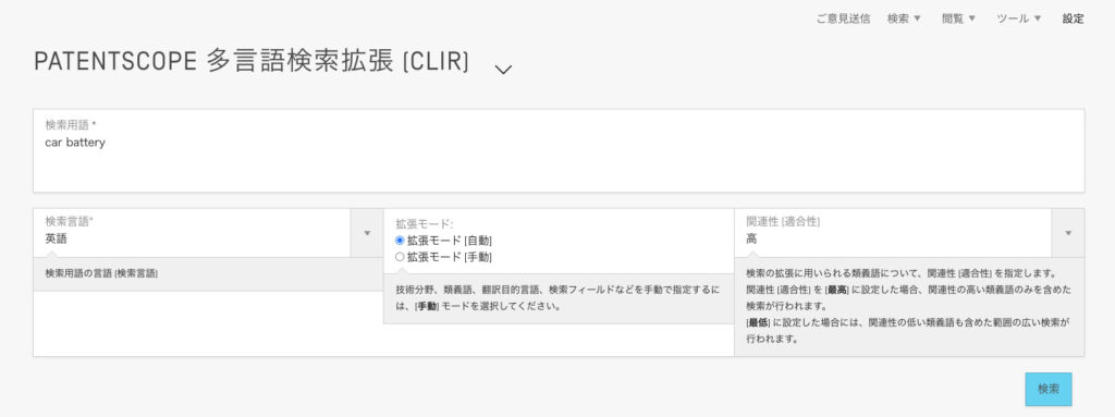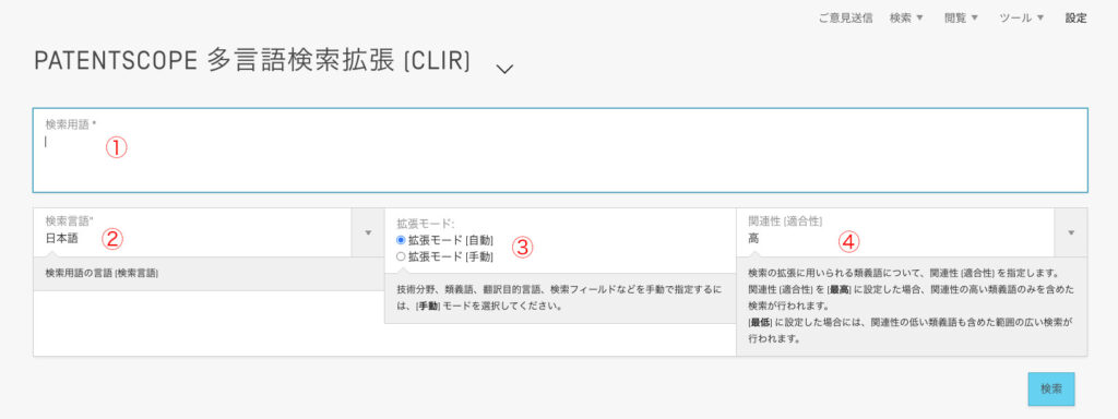 検索用語を入力し、検索言語、拡張モード[自動]を選択し、関連性を選択して、「検索」ボタンをクリックします。