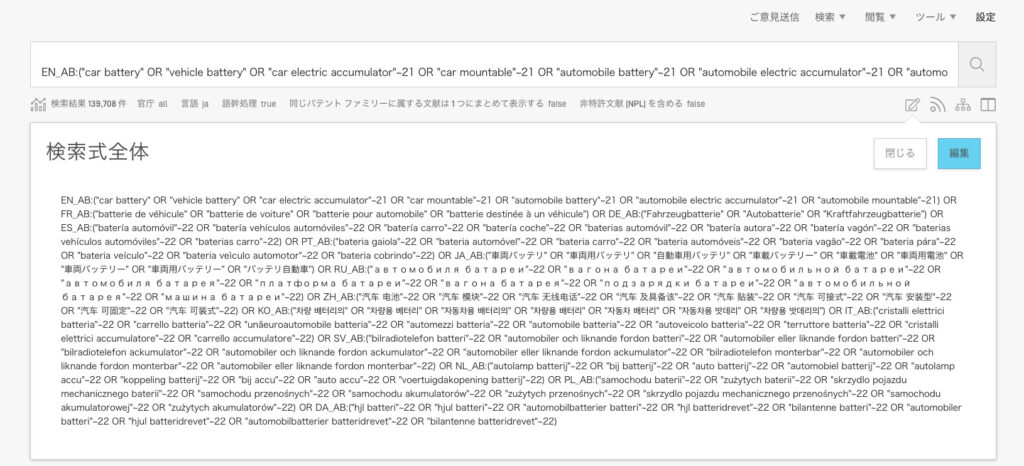 多言語に拡張された検索式を確認するには、右の鉛筆のアイコン「検索式全体を表示」をクリックします。