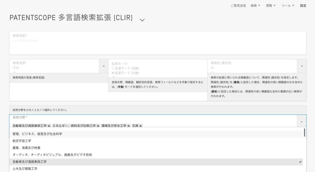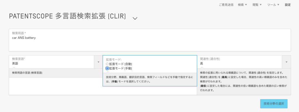拡張モード[手動]で検索を行うには、検索用語を入力し、検索言語、拡張モード[手動]を選択し、関連性を選択して、「技術分野の選択」ボタンをクリックします。
