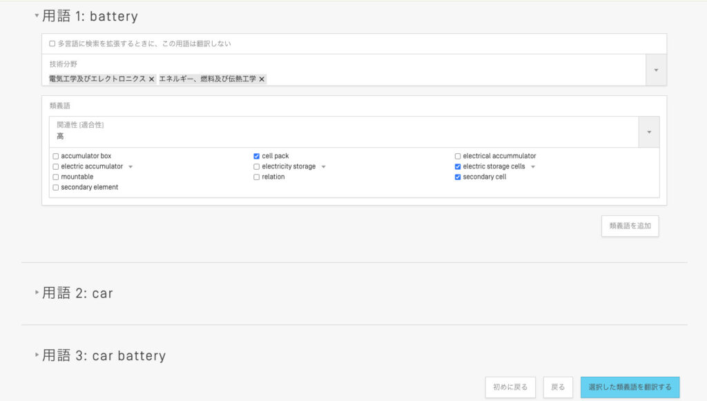 それぞれの検索用語の類義語の候補をクリックすると、全ての候補が表示されますので、関連性のある類義語をチェックします。