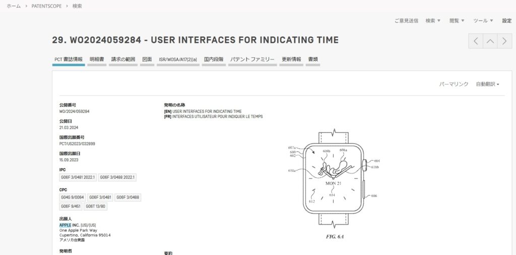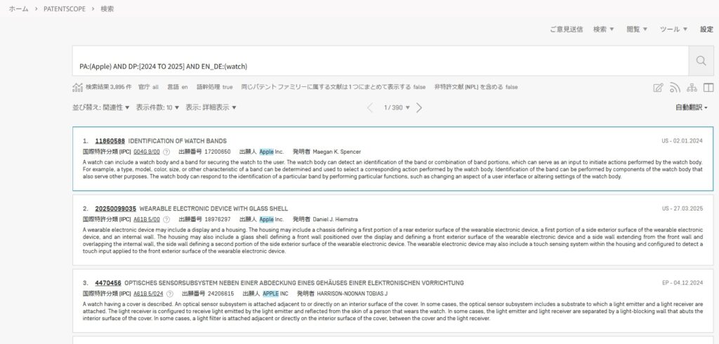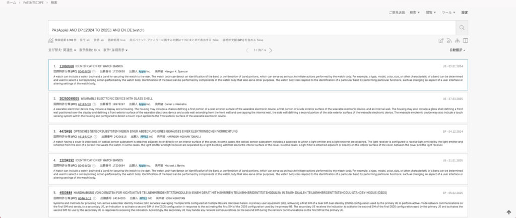 例えば、「Appleの出願で、2024年~2025年に公開され、明細書に ’watch’という単語が含まれている発明」を検索するには、「検索用語」に以下の式を記入して、