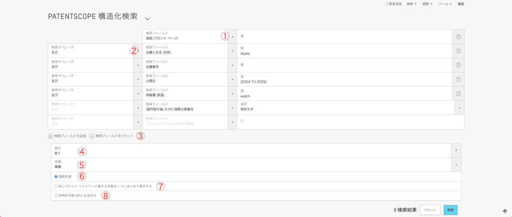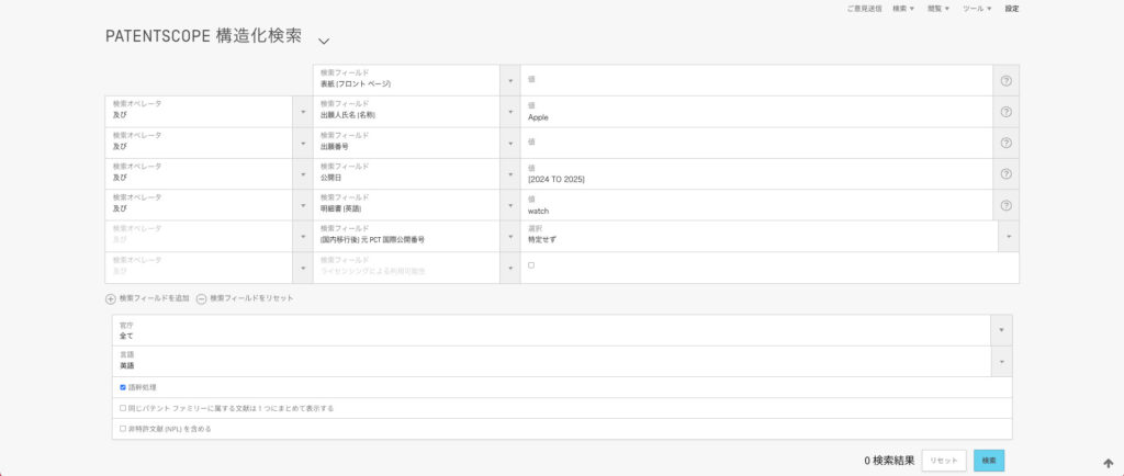 使用可能なオペレーターおよびフィールドコードついても、PATENTSCOPE簡易検索 の記事を参照してください。