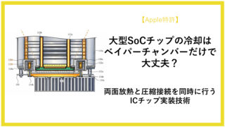 技術解説 大型SoCチップの冷却はベイパーチャンバーだけで大丈夫?――両面放熱と圧縮接続を同時に行うICチップ実装技術 (US12046534B2) スマートフォンのCPUなど大型ICの冷却に関するAppleの特許を解説。大型SoC時代の課題である発熱と接触信頼性に対し、蒸気冷却(ベイパーチャンバー)などを使った両面放熱と圧縮接続を組み合わせた実装技術を分かりやすく読み解きます。 2026.04.19 技術解説