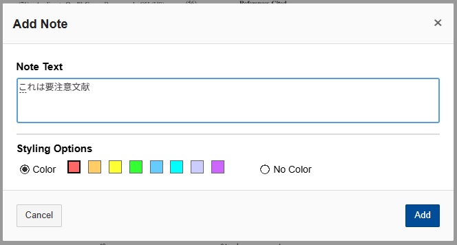 Noteの入力画面が表示されるので、テキストを入力し、ノートの色を選んで、「Add」ボタンをクリックします。