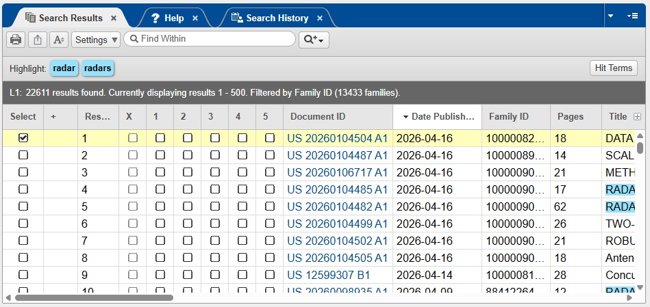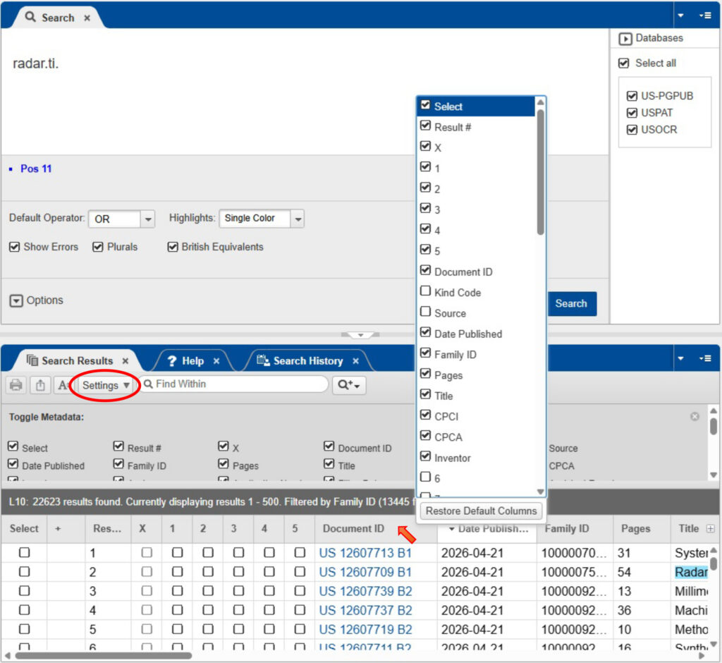 一覧は、デフォルトで 29個の列見出しが表示されます。(Document ID, Date Published, Family ID, Pages, Title, CPCI, CPCA, Inventor, Assignee, Application Number, Filing Date, Primary Examinerなど)
