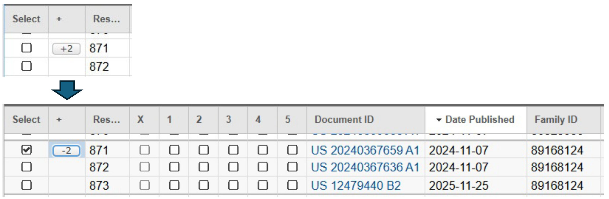 「+」列に「+2」などの表示がある場合、その文献に関連する特許ファミリー文献が存在することを表しています。「+2」をクリックするとその下にファミリーが展開表示されます。