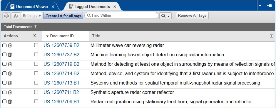 - Tagged Documents:Document Viewer の一部として表示され、タグ付けした文献を「L#」として保存したり、印刷したり、引用検索に使用することができます。