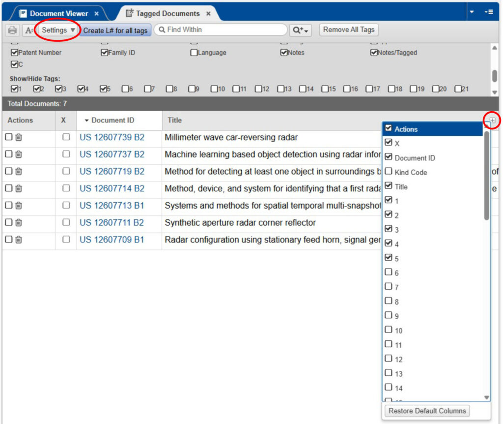 Tagged Documents の「Settings」または右にある小さな「+」ボタンを押すと、書誌的事項とタグの表示項目を設定できます。タグ「1」の文献だけを表示したい場合は、ここで設定することができます。
